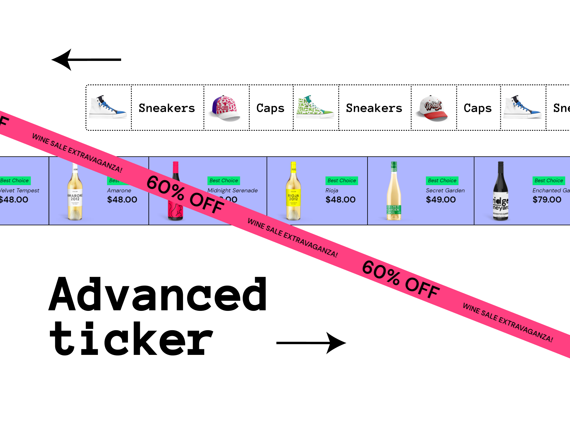 Announce a flash sale, free shipping, etc. Available on header, footer, and body page. Even at the menu popup.