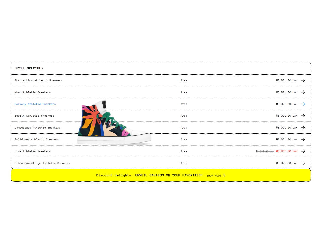 Display a product list that reveals an image of each item when you hover over it.